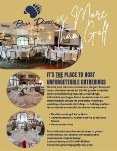 For additional inquiries, email our Food and Beverage Manager, Michel Autret: 303-996-1561 or fandb@beardancegolf.com.