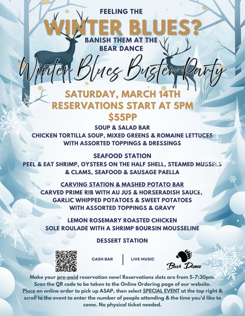 Restaurant Winter hours are now in effect OPEN at 4pm FOR DINNER ONLY WEDNESDAY THROUGH SATURDAY Closed on Sunday, Monday, Tuesday ORDER ONLINE (take out) Beer/Wine/Cocktail List Dinner Menu & Specials Wednesday-Saturday