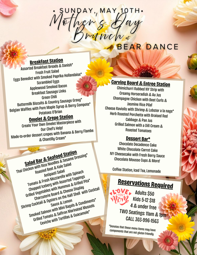 ORDER ONLINE (take out) Beer/Wine/Cocktail List Grill Menu Thurs-Saturday Dinner Menu The 2026 Easter Brunch is Sold Out! Reservations now open for Mother’s Day, May 10th Call 303-996-1563 to make your reservation now!